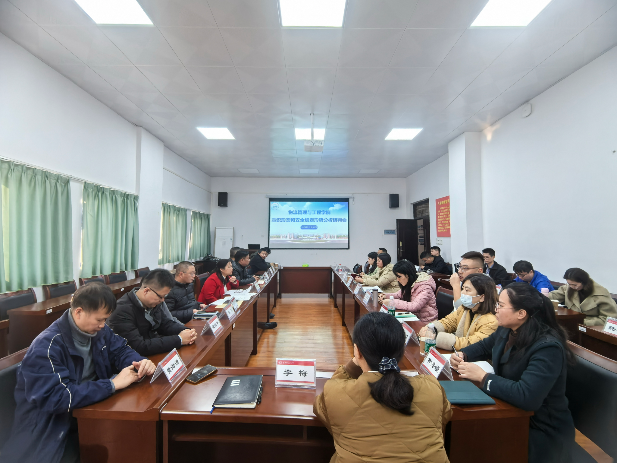 12月31日下午,物流管理与工程学院于武鸣校区地化楼C414会议室召开意识形态和安全稳定形势分析研判会,学院全体教职工参加会议,会议由学院党委书记陈兵主持。