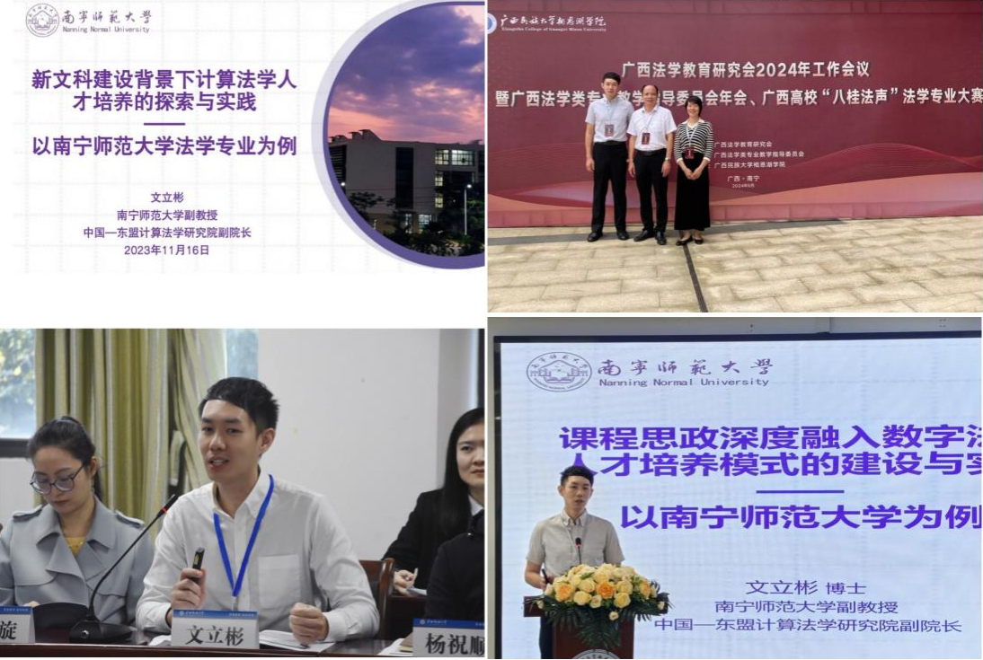 法社院数字法学人才培养以“专思融通”为核心,强调将思政教育贯穿于数字法学理论学习和法律实践的全过程,通过课程驱动实现法学知识与数字科技的深度融合,并借助多方协同机制构建多元协同育人体系。在课程体系建设方面,针对数字法学的发展需求,对课程逻辑与目标体系进行了重构,优化了课程体系和内容。一方面开设了数字法学导论、数据法学等基础理论和技术课程,另一方面设置了数字要素治理、数字应用治理等应用实践课程,以及法学与计算机科学、法学与经济学等交叉融合课程,全面覆盖了数字法学的各个领域。在人才培养方面,学院注重培养学生的实践能力和创新精神。一方面我院依托数学与统计学院、计算机与信息工程学院共同建立了南宁师范大学中国—东盟计算法学研究院,以持续推进数字法学课程建设与人才培养。另一方面学校与司法机关、律师事务所、科技公司等多家单位共建了实践实习基地,组建了“实践导师”教学团队,打通了产学研用链条。同时,学校还积极组织学生参加各类创新创业大赛和法律实践活动,让学生在实践中锻炼和提升自己的能力。