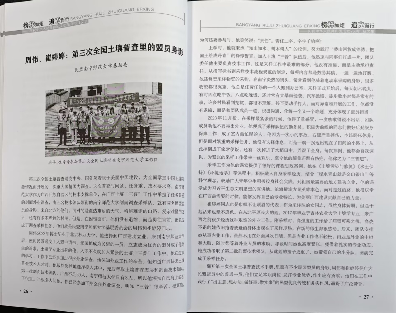 我校环境与生命科学学院教师、民盟盟员周伟作为第三次全国土壤普查南宁师范大学工作队骨干,其采样事迹在民盟广西区委庆祝中华人民共和国成立75周年征文集中被宣传报道。