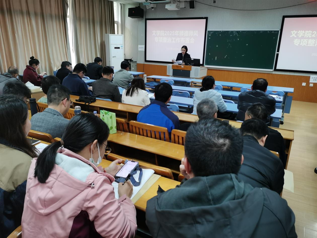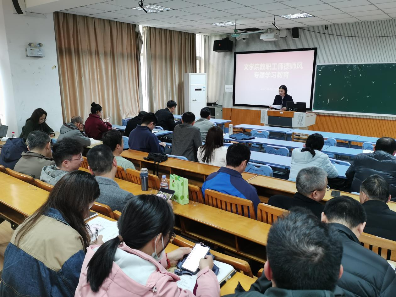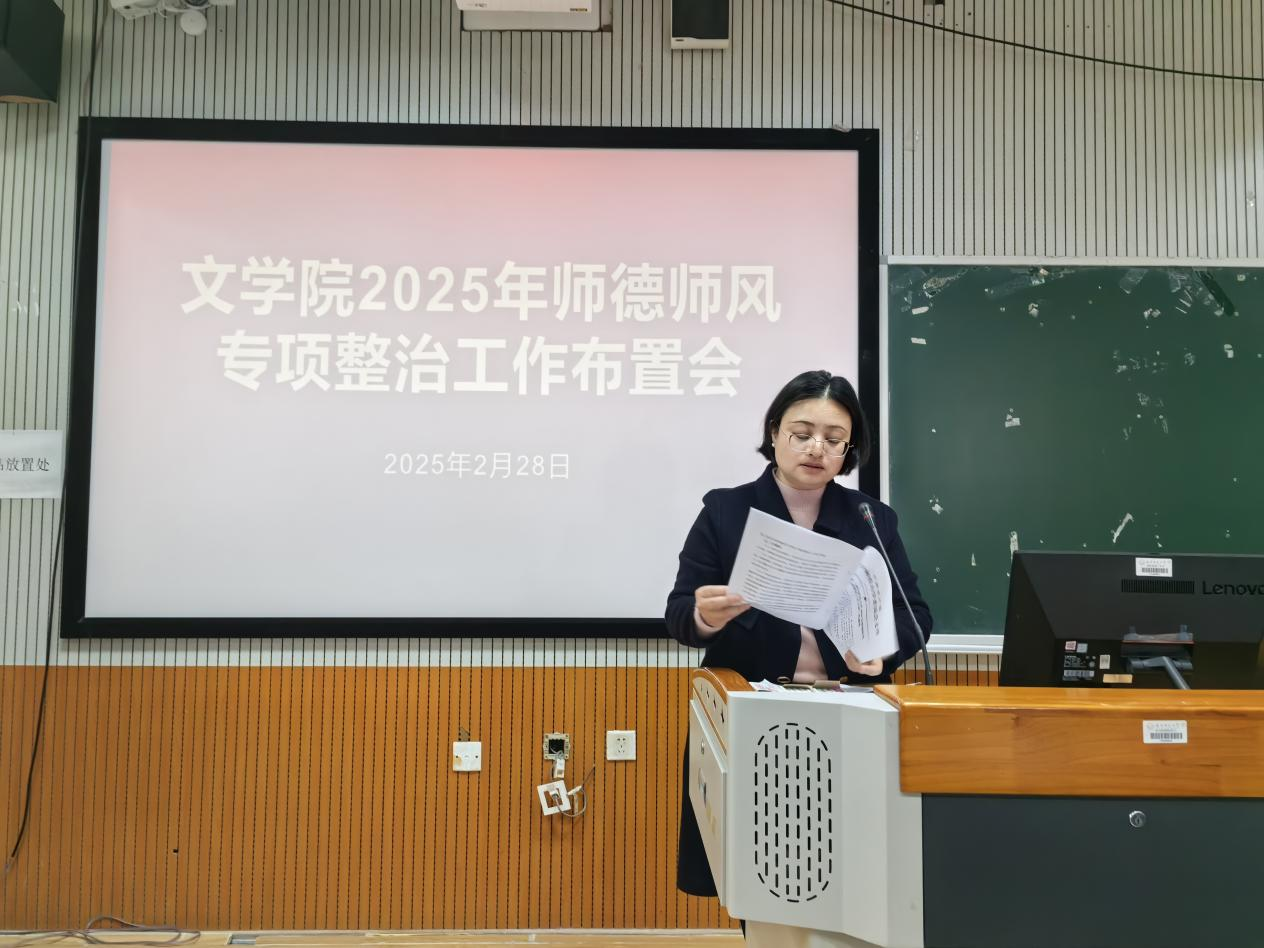 为进一步加强新形势下师德师风建设,根据学校统一部署,2025年2月28日下午,文学院在明秀校区文星楼召开了2025年师德师风专项整治工作布置会并开展师德师风专题学习教育。会议由文学院党委书记旷晓霞主持,全体教职工参加了本次会议。