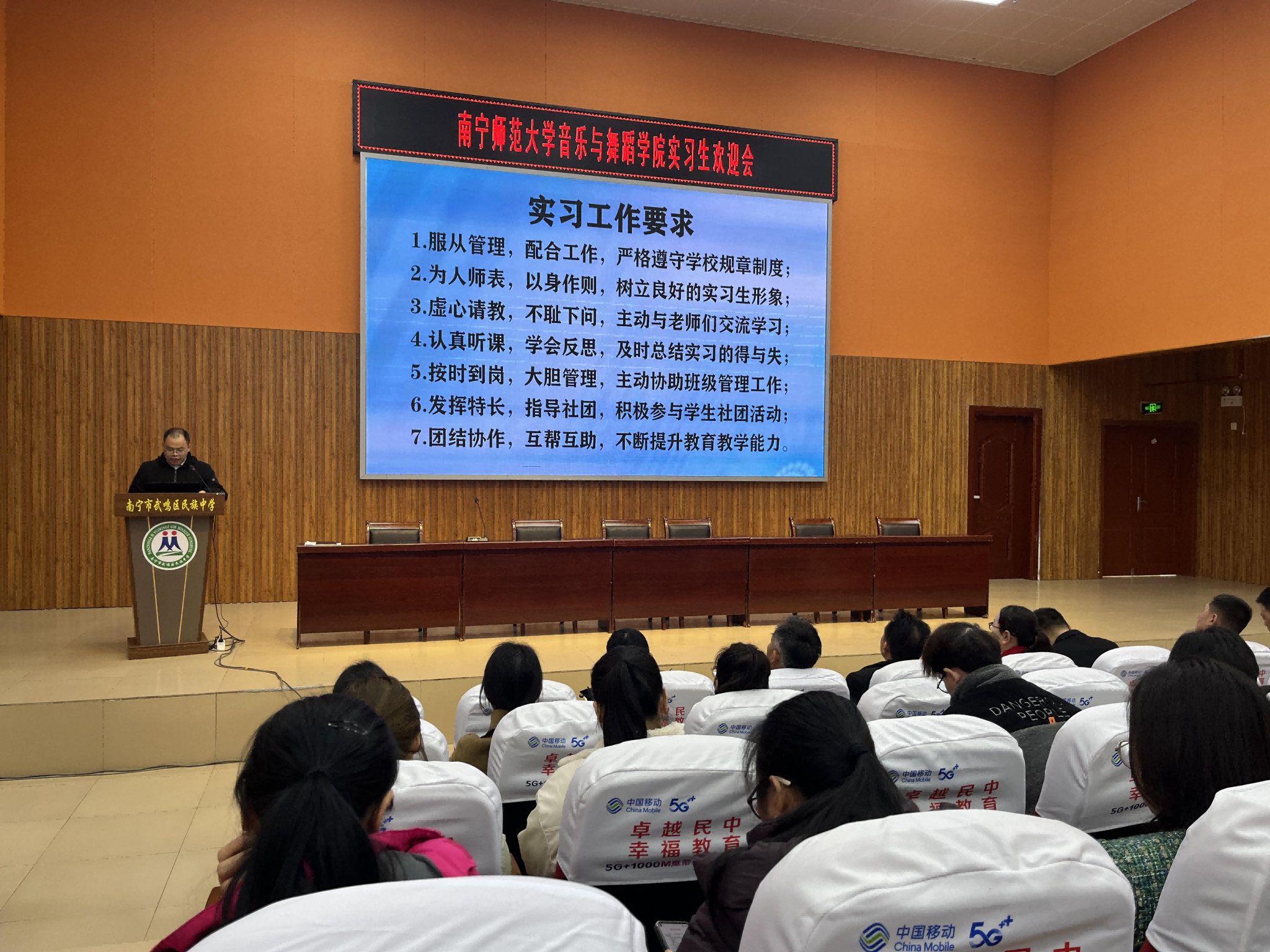 3月10日下午,南宁市武鸣区民族中学在迎熙厅(小报告厅)召开南宁师范大学音乐与舞蹈学院实习生欢迎会。武鸣区民族中学校领导、教师代表与我校音乐与舞蹈学院师生代表齐聚一堂,共同见证实习工作的正式启动。我校音乐与舞蹈学院师生约30人,以及民族中学七、八年级音乐教师、班主任、年级主任和相关处室负责人参加了会议。