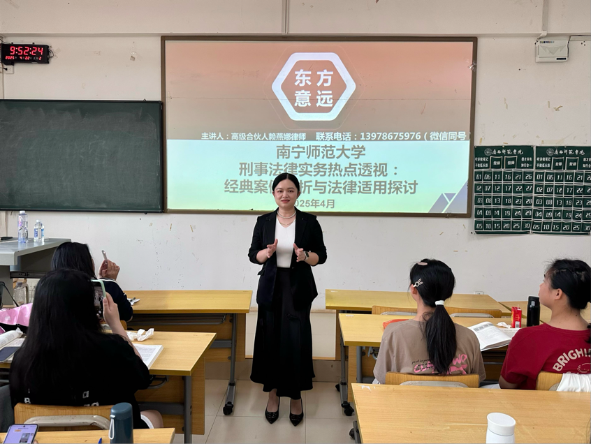 为深化产教融合,提升法学专业学生的理论素养和实践能力。4月22日上午,明法论坛第十七期讲座在南宁师范大学(五合校区)五综108教室举行。本次讲座以“刑事法律实务热点透视:经典案例解析与法律适用探讨”为主题,由广西东方意远律师事务所高级合伙人赖燕娜律师担任主讲,法律系文立彬副教授主持。