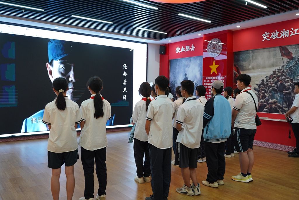 在学院学生宣讲团成员的引导下,学生们分组有序参观,以25幅油画作品为载体,展示中共一大上海会址、八一南昌起义、开国大典等经典场景的党史国史育人画廊。在“湘江战役虚拟仿真实验中心”,借助AR眼镜辅助教学的现代化应用模式,沉浸式体验湘江战役的激烈场景,感受革命先辈们英勇无畏的牺牲精神,这极大地激发了青少年对马克思主义中国化进程的浓厚兴趣。