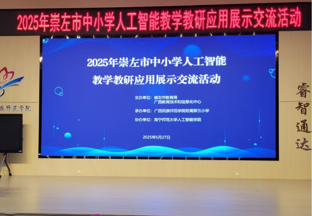5月27日,由崇左市教育局、广西教育技术和信息化中心主办,南宁师范大学人工智能学院协办的“崇左市中小学人工智能教学教研应用展示交流活动”在广西民族师范学院附属第三小学顺利开展。崇左市教育局副局长梁培生出席活动并致辞,各县(市、区)教育局领导、教研电教部门负责人及全市200余名中小学教师代表齐聚一堂,共同探讨人工智能赋能基础教育新路径。