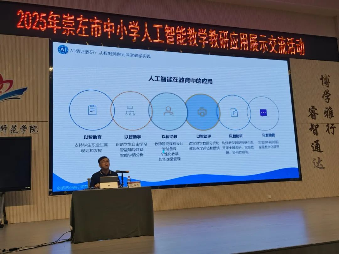南宁师范大学人工智能学院副院长欧启忠教授以“人工智能循证教研”为主题,带来了一场精彩纷呈的专题讲座。欧启忠结合丰富案例,深入剖析人工智能在基础教育循证教研的深度应用,从理论框架到实践操作,为与会者提供了全面且实用的指导,充分展示了我校专家团队在推动人工智能赋能基础教育教研方面的专业引领能力。同时,广西民族师范学院附属第三小学校长陈留也进行了专题分享,附三小语文组教师则现场展示了人工智能在语文教研中的应用成果,生动呈现了新技术为教学带来的创新与变革。