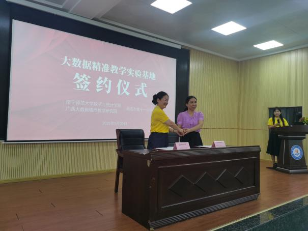 5月30日,以我校数学与统计学院为依托成立的广西大数据精准教学研究院与北海市第十一中隆重举行“大数据精准教学实验基地”签约揭牌仪式。北海市第十一中学校长张清、广西大数据精准教学研究院负责人张桂芳、我校数学与统计学院副院长韦扬江、北海市教育科学研究所副所长纪贤勇、精准教学平台技术研发单位广西教育出版社社长石立民、北海市第十一中学的部分家长代表等领导嘉宾出席签约仪式。