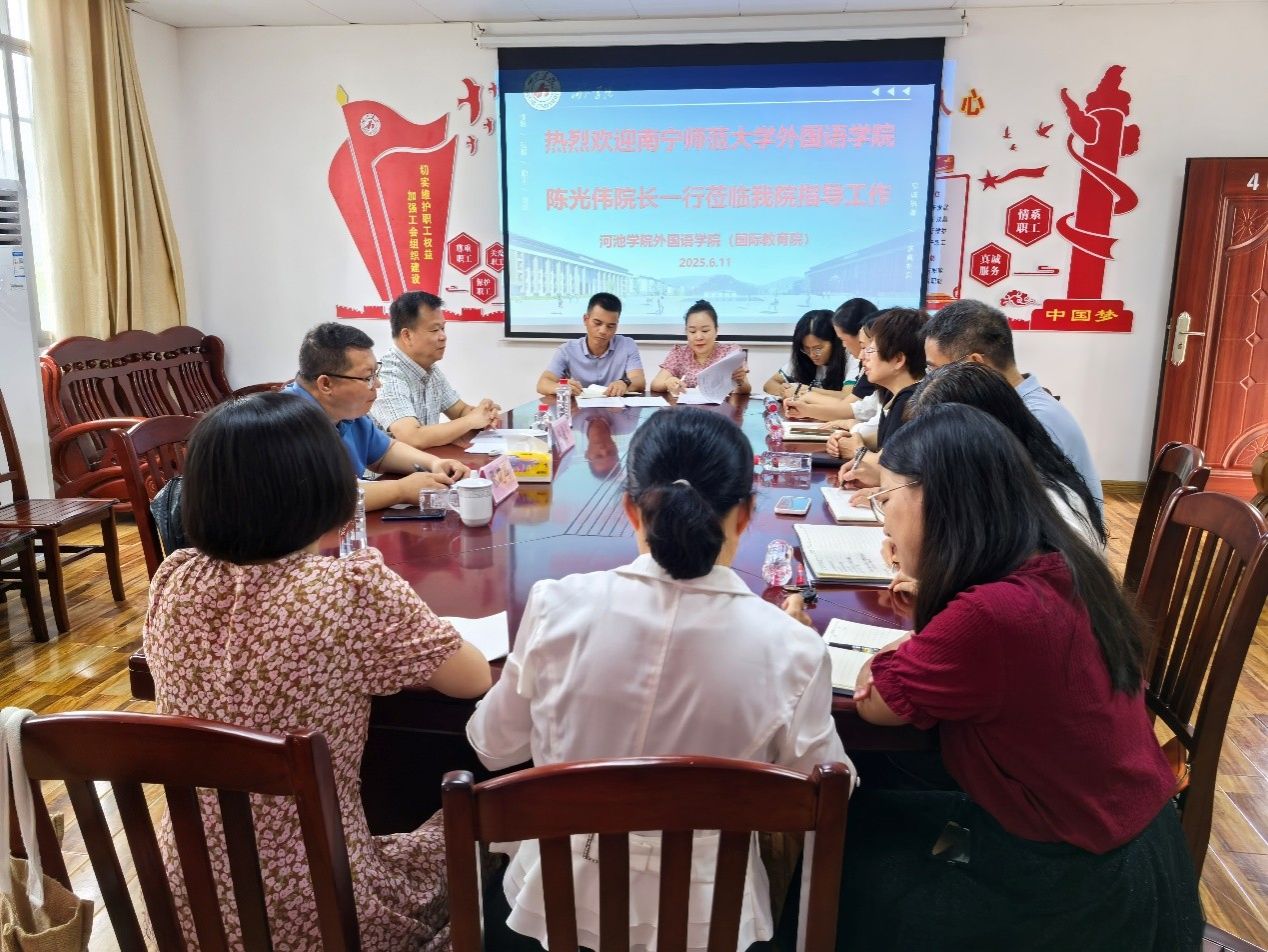 根据南宁师范大学2025年对口支援工作计划,6月11-12日,外国语学院院长陈光伟、副院长张晓鹏一行2人到河池学院外国语学院开展了交流活动,指导该院的本科教育教学审核评估的迎评工作及师范认证的持续改进工作。