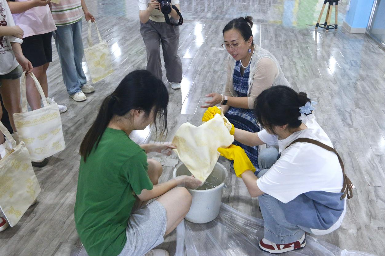 随后,同学们在杨帆老师的悉心指导下,投入到非遗植物扎染的手工制作环节。扎染技艺作为我国古老的纺织品染色工艺,以其独特的艺术风格和深厚的文化底蕴备受推崇。同学们通过折叠、捆绑、染色、固色等一系列步骤,充分发挥自己的创意与想象力,制作出了一件件色彩斑斓、图案独特的扎染作品。这些作品不仅展现了同学们的巧思妙想,更体现了非遗技艺在当代青年手中的传承与创新。