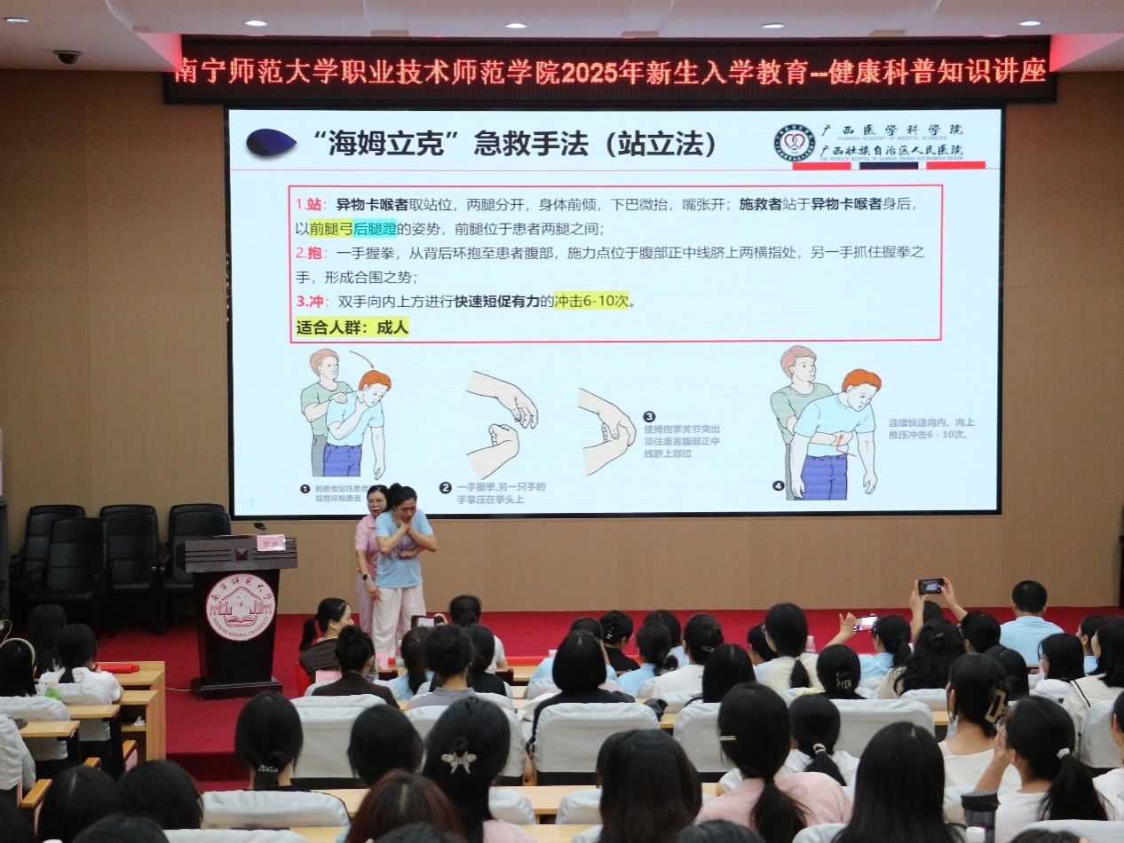 9月9日下午,职业技术师范学院在文星楼301报告厅举办2025级新生入学教育系列之健康科普知识讲座。讲座由广西壮族自治区人民医院的刘芳和黎艳担任主讲嘉宾,主题聚焦于日常健康管理和紧急救援。