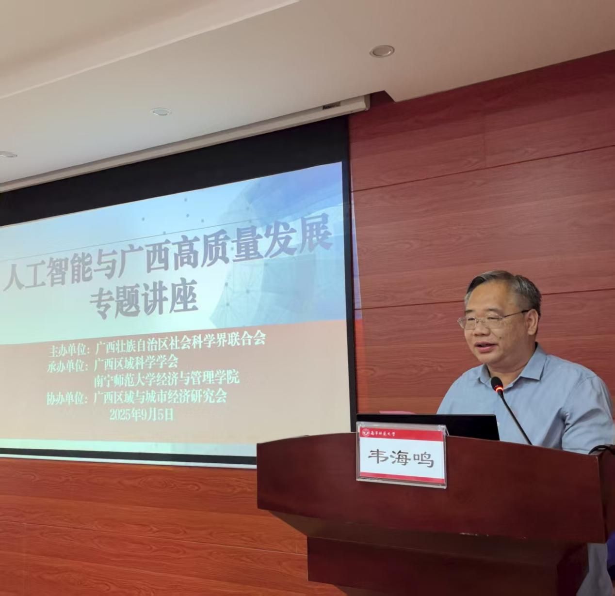 为深入学习贯彻习近平总书记关于人工智能的重要论述,贯彻落实自治区党委关于发展人工智能赋能千行百业的决策部署,聚焦人工智能与广西经济社会各领域融合发展的关键问题,探索高质量发展新路径、新动能。9月5日,由广西壮族自治区社会科学界联合会主办,广西区域科学学会与南宁师范大学经济与管理学院承办,广西区域与城市经济研究会协办的“人工智能与广西高质量发展”专题讲座在学校五合校区顺利举行。本次讲座由经济与管理学院党委书记韦海鸣教授主持,来自校内外专家、学者约60人参会。