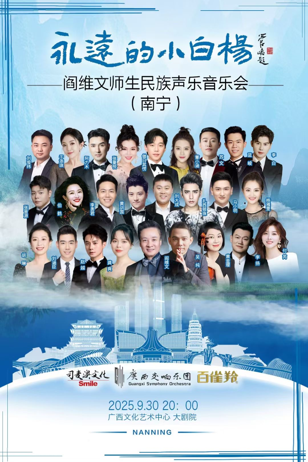 2025年9月30日,由南宁市文化广电和旅游局指导,广西旅游发展集团支持的“永远的小白杨”阎维文师生民族声乐音乐会在广西文化艺术中心大剧院成功举办。音乐与舞蹈学院党委委员、院长助理,刘俊纬副教授受邀参加演出。