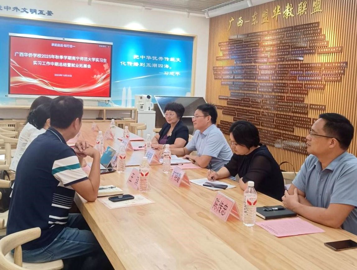 为提升教育实习质量、优化实习管理流程、深化两校合作交流,10月20日下午,国际教育学院党委书记旷晓霞、院长杨绪明、副院长蒋招凤和陈传、实习带队教师李胜兰博士一行5人前往广西华侨学校,开展访企拓岗促就业暨2025年秋季教育实习中期检查工作。广西华侨学校覃志坚副校长,留学部寇美睿主任、王琪主任,实习指导教师及南宁师范大学国际教育学院14名实习生共同参会。
