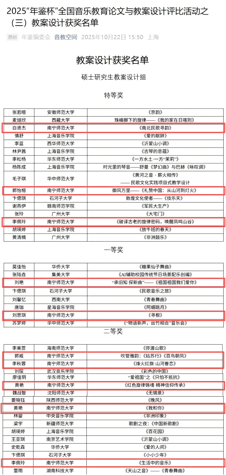 近日,由《中国音乐教育年鉴》编委会主办,上海音乐学院承办的2025年“年鉴杯”全国音乐教育论文与教案设计评比活动近日圆满落幕。我校音乐与舞蹈学院研究生在比赛中表现优异,共有8名同学的12项作品获奖。