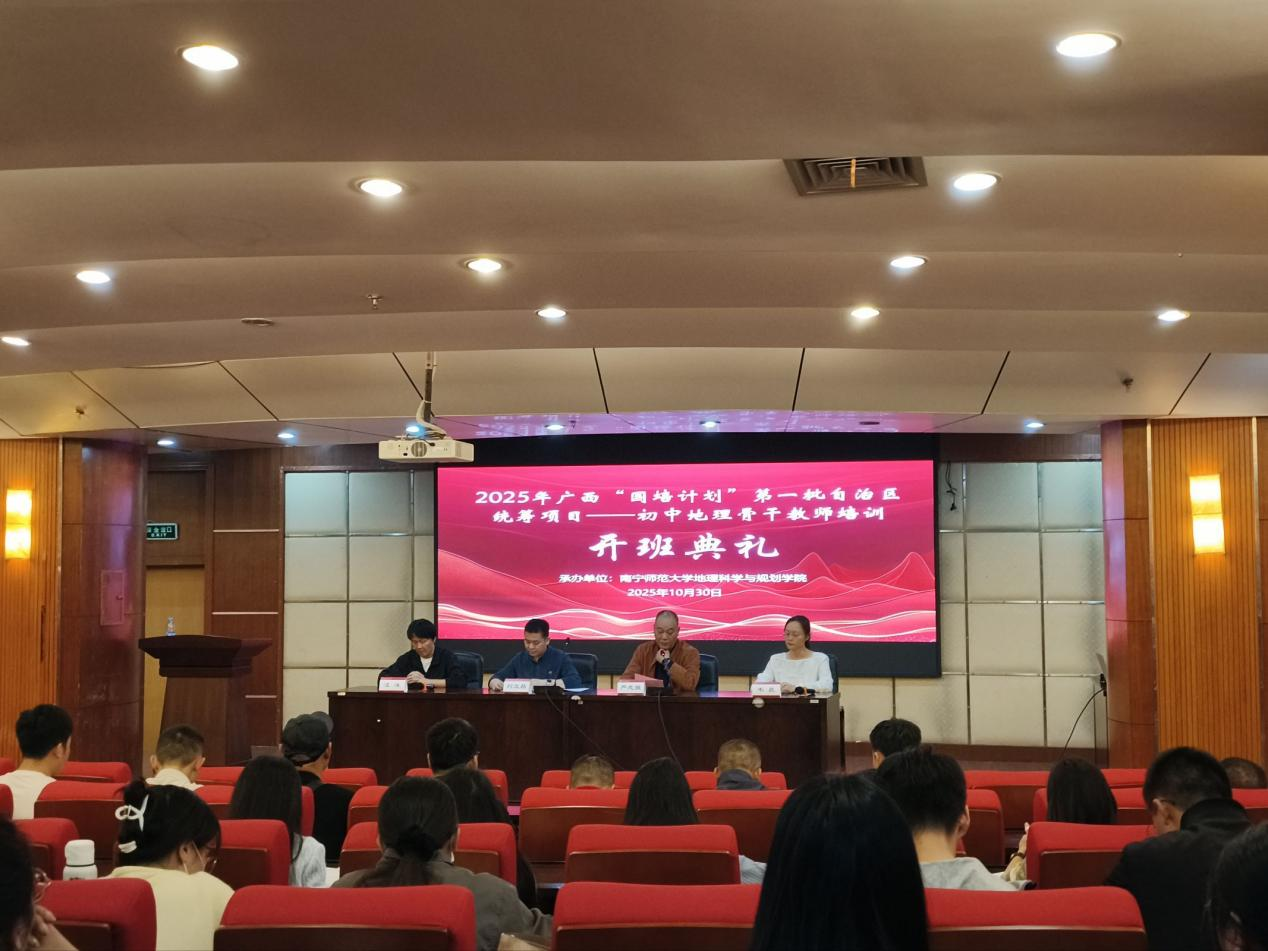 10月30日,由我校承办的2025广西“国培计划”第一批自治区统筹项目——初中地理骨干教师培训在南宁师范大学明秀校区图书馆三楼报告厅顺利开班,我校地理科学与规划学院党委书记严志强教授、刘立昌副教授,地理科学系副主任韦晨、汪洋博士以及来自广西全区各市的120名初中地理学科、骨干教师参加开班仪式。