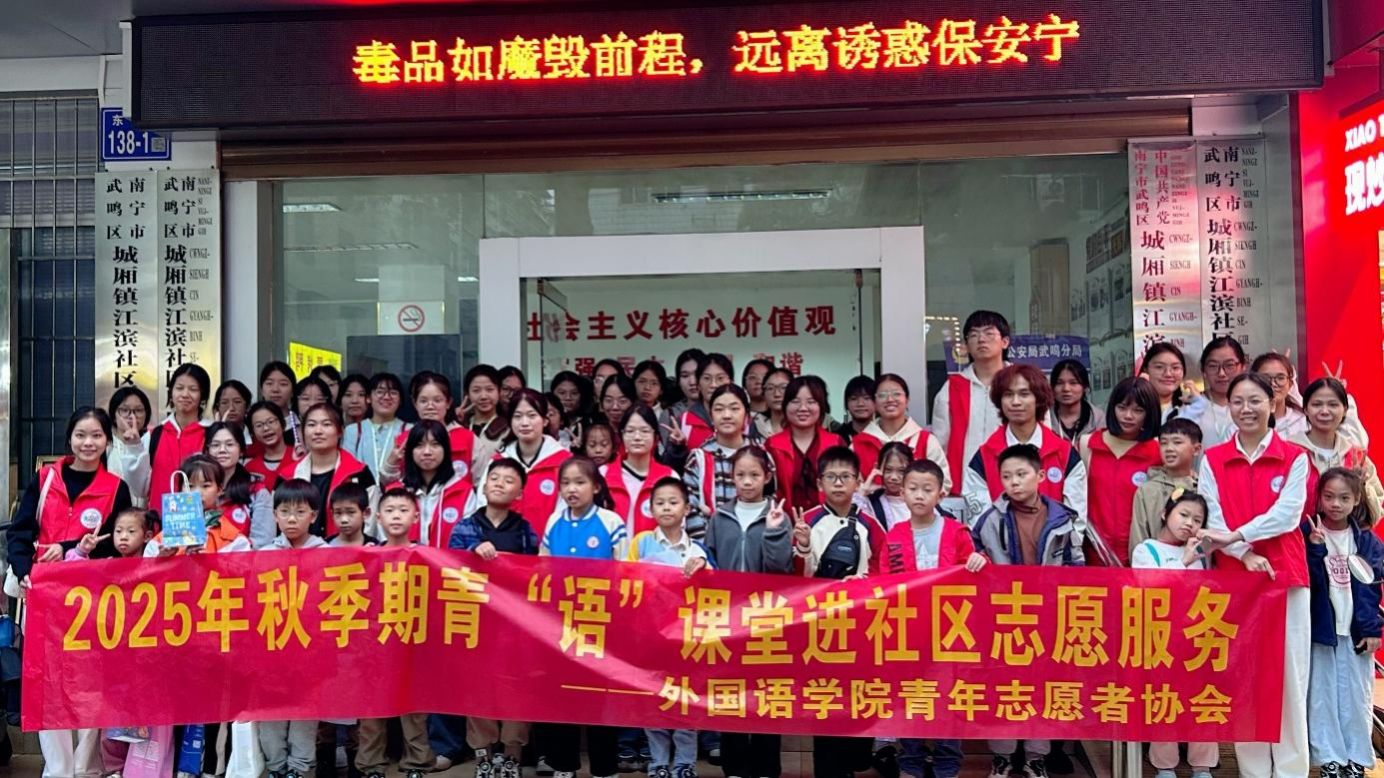 11月2日,南宁师范大学外国语学院青年志愿者协会携手江滨社区,启动2025年秋季“青”语课堂进社区志愿服务。19名青年志愿者化身“小老师”,为社区小朋友带来精准化、趣味化的义务家教活动。