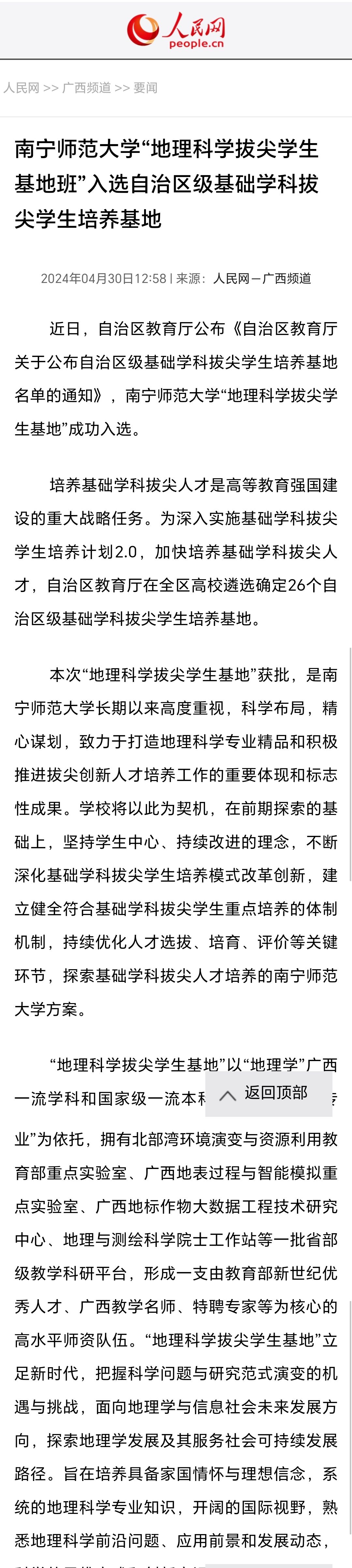【人民网】南宁师范大学“地理科学拔尖学生基地班”入选自治区级基础学科拔尖学生培养基地