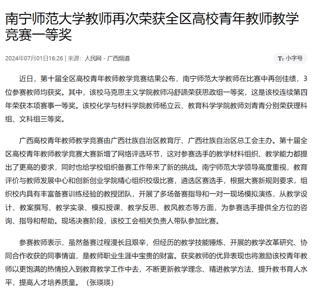 【人民网】南宁师范大学教师再次荣获全区高校青年教师教学竞赛一等奖