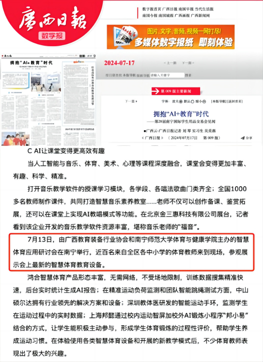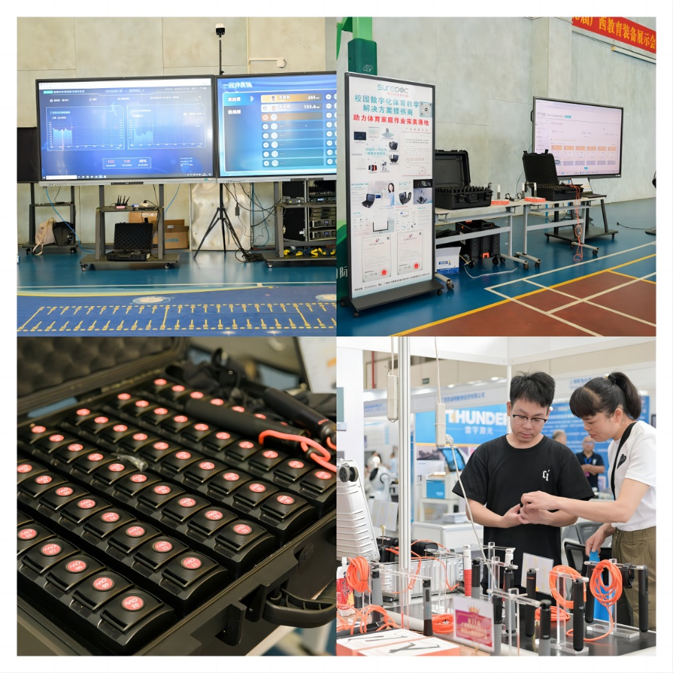 在展会上,广西教育装备行业协会展示了多款创新体育教育设备,包括鸿合智慧体育产品、上海邦懿科技有限公司、邦小易AI运动智屏、鸿合迹动和深圳教体医智能运动手环。这些设备无需网络连接且不受场地限制,能够精准、快速地收集训练数据,并实时生成人工智能报告,显著提升了体育教学的智能化水平。与会教师对此高度关注,认为智慧体育设备不仅能够提升体育教学质量,还能有效激发学生的运动兴趣和参与热情,从而显著改善学生在体育课上的表现和学习效果。