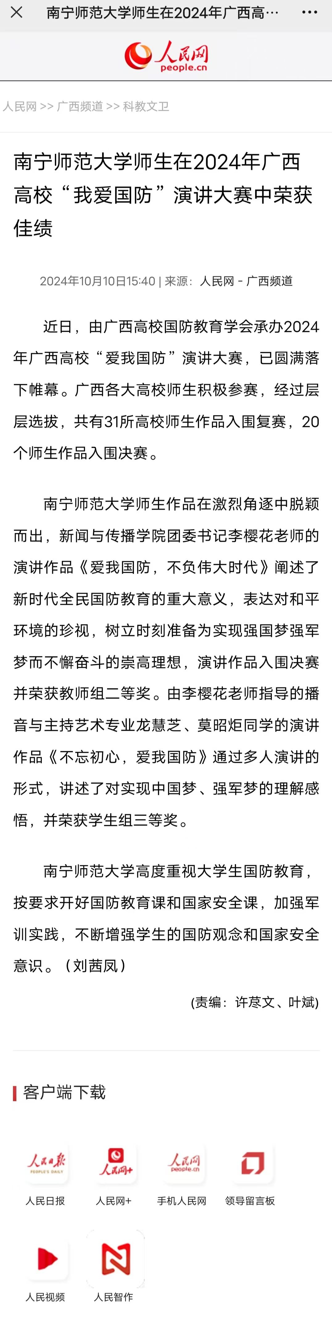 【人民网】南宁师范大学师生在2024年广西高校“我爱国防”演讲大赛中荣获佳绩