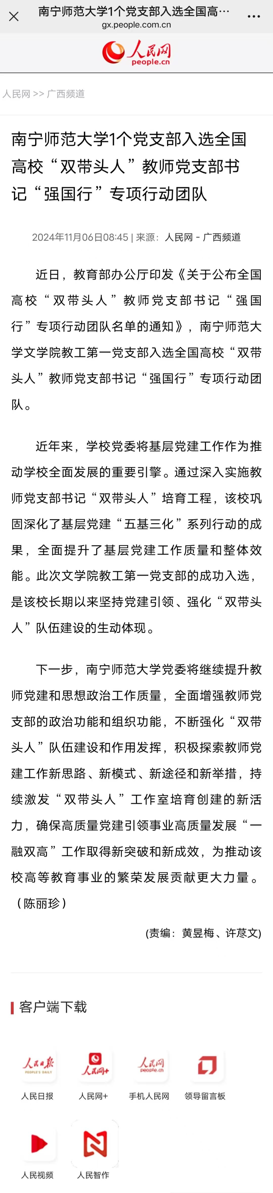 【人民网】南宁师范大学1个党支部入选全国高校“双带头人”教师党支部书记“强国行”专项行动团队