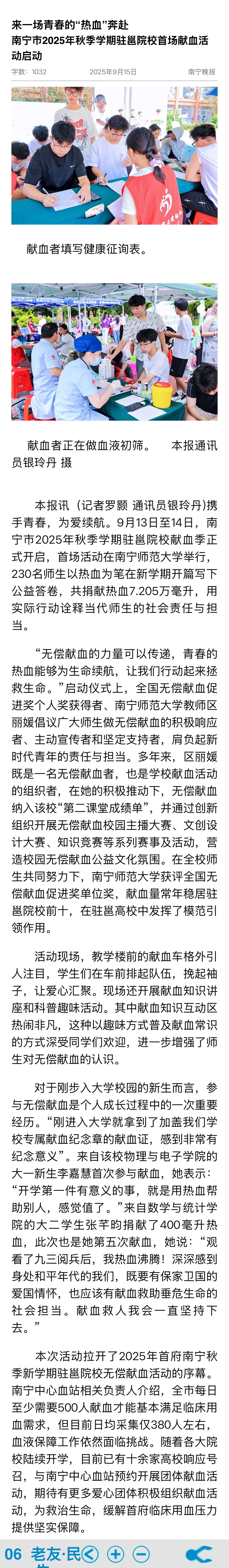 【南宁晚报】来一场青春的“热血”奔赴 南宁市2025年秋季学期驻邕院校首场献血活动启动