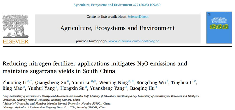 2024年8月22日,Elsevier旗下生态环境领域知名期刊Agriculture, Ecosystems and Environment(农业综合、生态和环境领域A类期刊,中科院SCI期刊分区最新升级版1区Top期刊,影响因子6.4)在线发表了我校地理与海洋研究院李卓亭团队关于甘蔗生态系统温室气体排放机理及减排潜力的最新研究成果:Reducing nitrogen fertilizer applications mitigates N2O emissions and maintains sugarcane yields in South China.该论文以南宁师范大学北部湾环境演变与资源利用教育部重点实验室为第一完成单位,李卓亭副研究员为第一作者兼通讯作者,合作作者包括:地海院研究人员徐强胜、毛兵、杨云卉、苏宏新、杨元征和胡宝清;在读硕士研究生陆艳妮和宁文婷,以及广西农垦金光农场有限公司高级农艺师伍荣冬和李廷化。