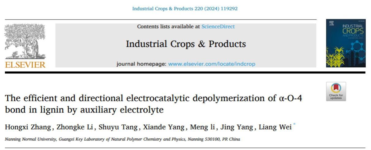 团队以高效催化断裂木质素中最稳定的C-O键和C-C键为目标,旨在解决木质素催化解聚效率低、选择性差的科学难题。首先,创新性使用非金属催化剂四丁基四氟硼酸铵(TBABF4)解聚木质素及其模型化合物。通过调控电场,使TBABF4同步协同发挥了催化剂和电解质的双重作用,在空气、室温和低电流条件下,对α-O-4型木质素模型分子的转化率高达95.7 %,主要产物苯甲醛二甲缩醛的收率高达92.4 %。该工作以“The Efficient and Directional Electrocatalytic Depolymerization of α-O-4 Bond in Lignin by Auxiliary Electrolyte”为题发表于化学领域国际权威期刊《Industrial Crops and Products》(中科院一区,IF=5.6)。