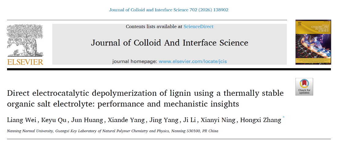 我校化学与材料学院“能源与环境催化”创新团队在电催化解聚木质素领域取得重要研究进展。该团队成功利用一种热稳定的有机盐电解质,实现了木质素的直接电催化解聚,并对该过程的反应性能与机理进行了系统解析。这一研究成果以“Direct Electrocatalytic Depolymerization of Lignin Using a Thermally Stable Organic Salt Electrolyte: Performance and Mechanistic Insights”为题,发表于化学领域国际权威期刊《Journal of Colloid And Interface Science》(中科院一区Top,IF 9.7)。该论文以南宁师范大学为唯一完成单位,韦良教授为第一作者,张宏喜教授为通讯作者,课题组杨晶、黄俊、杨显德博士参与了相关研究工作。