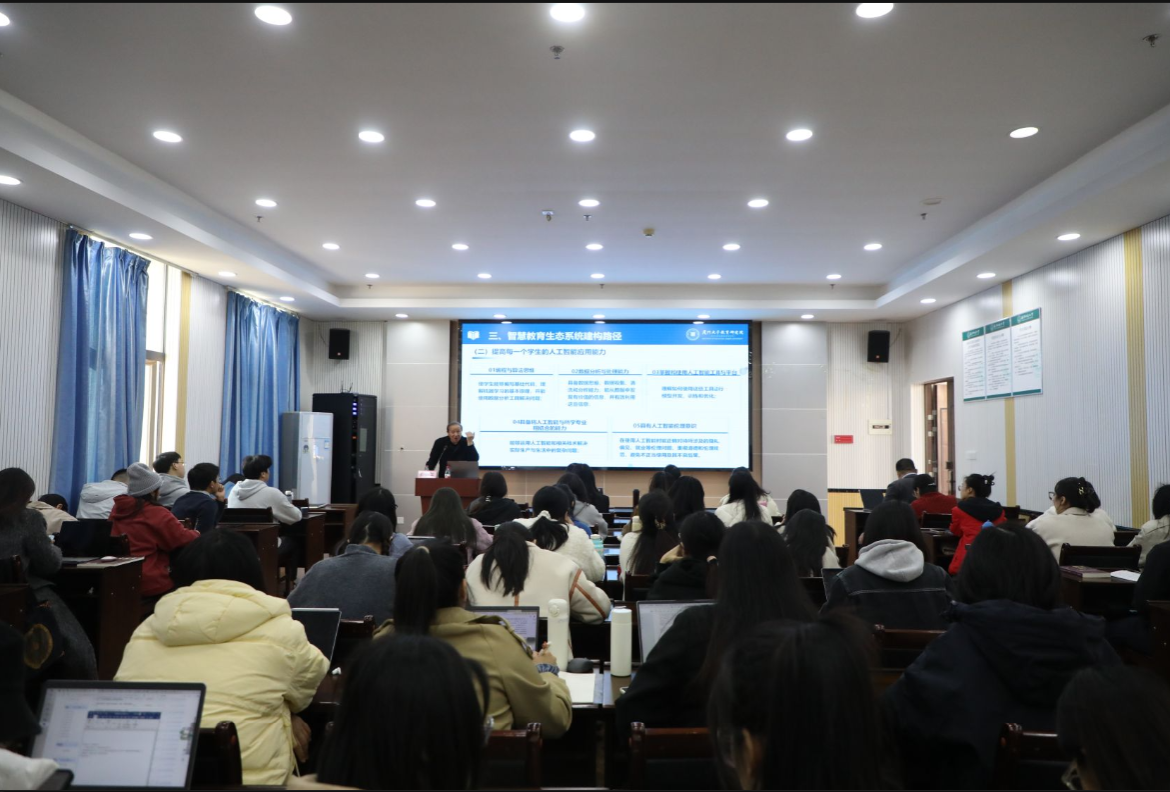 别敦荣教授在讲座中全面系统地阐述了智慧教育的内涵与特征,搭建关于智慧教育的初步认知框架,他深入分析了智慧教育生态系统及其构成要素,详细解读了智慧教育模式下,教师、学生、教学场景以及知识供给等方面所经历的深刻转变,进一步阐述了这些生态要素在人才培养、促进教育与智能经济社会的融合方面相互协作的方式。在此基础上,别敦荣教授分析了构建智慧教育生态系统的有效路径,并提出一系列切实可行的具体措施。在讲座的互动环节,师生们积极踊跃地向别敦荣教授提出了诸多智慧教育相关问题,别教授耐心细致地进行了解答交流。